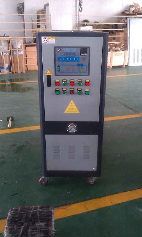 油溫機實質上是指利用導熱油做為傳熱媒介來進行加熱控溫的模溫機.油溫機自帶膨脹油箱,膨脹油箱有三大作用:補油、排氣及容納導熱油經過高溫之后的膨脹系數,在正常升溫過程中,油箱是不參與加熱過程的,高溫油溫機在使用初期,導熱油經膨脹油箱補充進入管路系統,經高溫泵強制液相循環,在需控溫的設備與機組系統之間循環,導熱油從機組的發熱裝置出來后,溫度升高,進入控溫設備后,熱量被吸收,再返回到系統的發熱管中繼續升溫,在此泵泵注入到需用熱設備中,周而復始,直至用熱設備達到設定溫度.