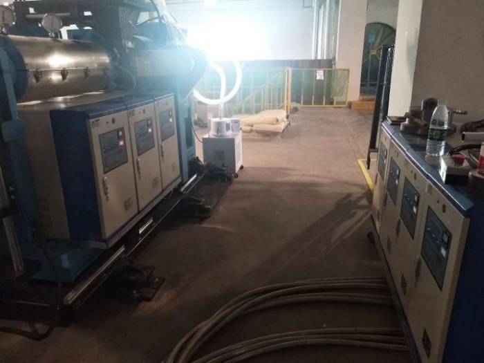 擠出的物料有橡膠擠出/冷喂料擠出/雙復合橡膠擠出等多種工藝,其控溫特色基本相同,分多個溫控區,每個溫控區所需要控制的溫度各不相同,擠出機的規格不同,其控溫區段的數量也會不一樣,可根據不同的擠出機,采取統一控溫或分段控溫,物料擠出前,模溫機需要將各被控區段的溫度升高至預設值,在物料擠出時,由于機械能被大量轉化為熱能,模溫機又需要通過熱交換來將這些熱量帶走,達到溫度恒定的作用。所以模溫機在擠出設備上的應用可以看作是一個擠出機主機啟動前的預熱升溫和主機運行過程中維持恒溫的過程。擠出分段控溫模溫機案例:客戶的擠出機每一個工藝段要求不同的溫度控制,推薦客戶使用雙回路模溫機或者多機一體模溫機來控制溫度,可以對擠出機設備中的各個工藝段同時進行獨立的加熱和冷卻,從而達到一機多用的目的。如果對每一個工藝段使用一臺加熱設備進行單獨的溫度控制,也能達到其技術要求,但是費用高占地面積大。